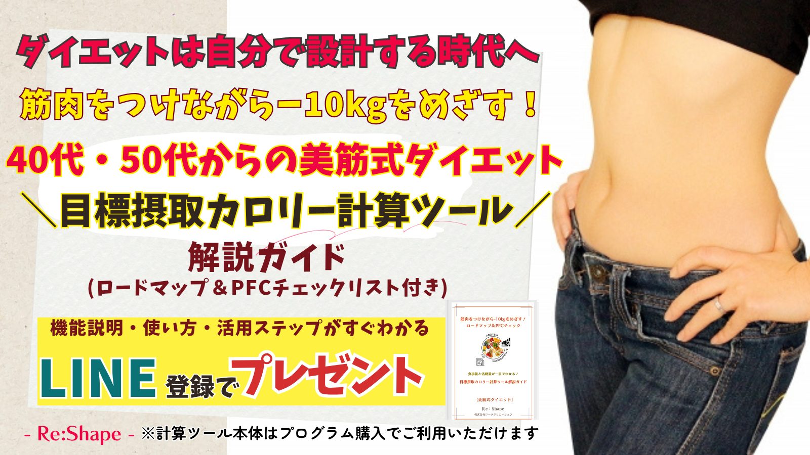 お申込みを迷っている方は、まずは「美筋式ダイエット・目標摂取カロリー計算ツール機能説明・使い方ガイド(-10kgロードマップ&PFCチェックリスト付き)」でご確認ください。
