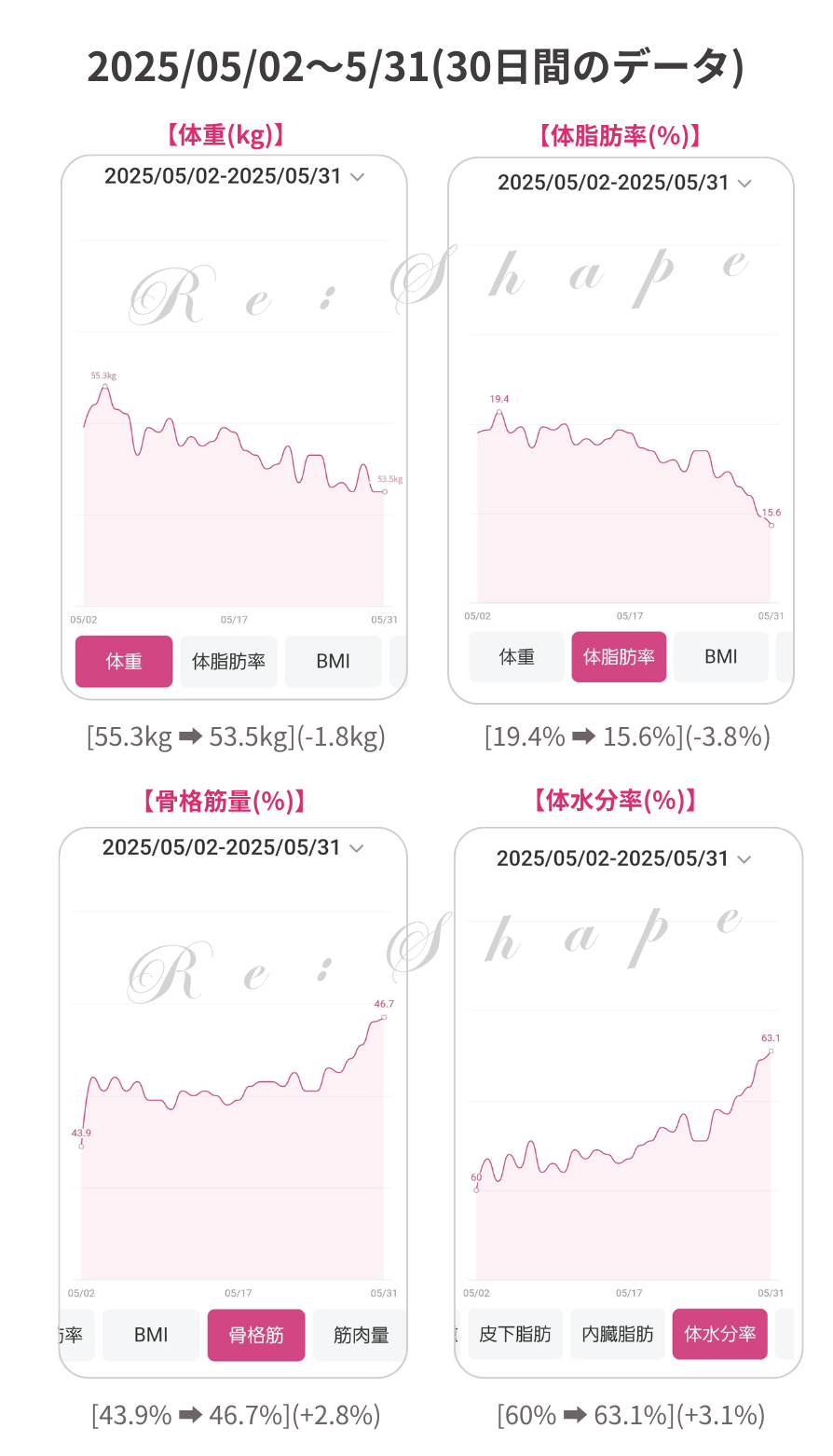 体脂肪率は1カ月でマイナス3.8%、一方で筋肉量(骨格筋率)は2.8%増えています。