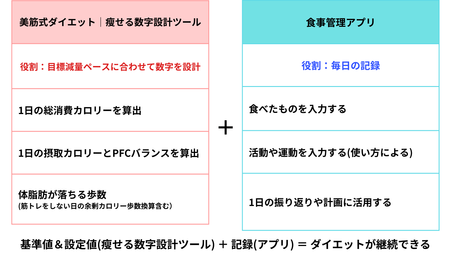 図のように、ツールで“基準”を設計し、アプリで“日々を整える”ことで、筋肉を守りながら脂肪を減らすしくみがつくれます。